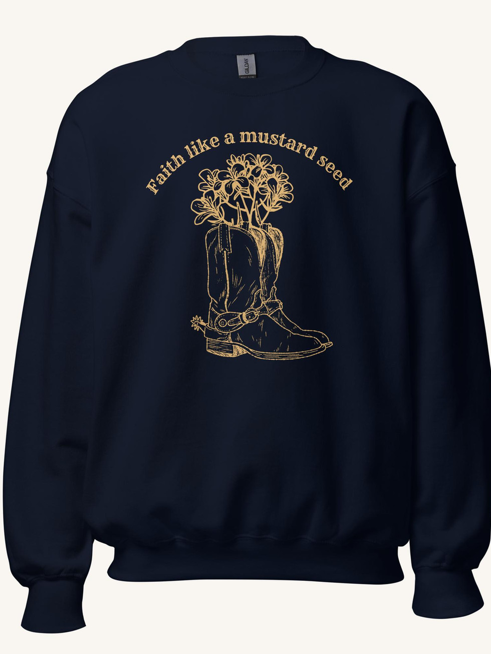 A little faith goes a long way. Our "Faith Like a Mustard Seed" crewneck is a beautiful symbol of this powerful truth. Featuring vibrant flowers blooming from a pair of classic cowboy boots, this design reminds us that even the smallest amount of faith can grow into something beautiful and strong. It’s a testament to the Western spirit of perseverance and the power of God's grace.